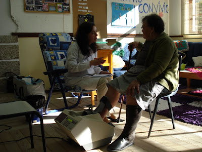 A Podologista, Joana, aquando as suas consultas no Centro de Convívio investiga e analisa os membros inferiores dos paciente com o objectivo de diagnosticar e adaptar a terapia em função das patologias que afectam o pé e as suas repercussões no organismo humano.